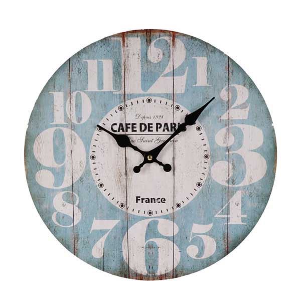שעון קיר דקורטיבי ומעוצב באיטליה בסגנון רטרו צרפתי. השעון מבית Tognana Italy הינו בקוטר 34 ס"מ ורוחב 3.8 ס"מ עשוי עץ MDF בצבע תכלת/אפור עם ספרות גדולות בצבע לבן.